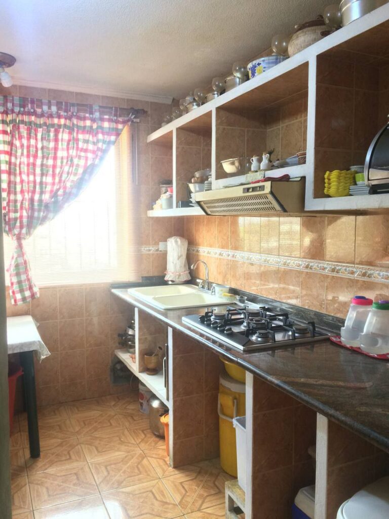 El apartamento cuenta con tres habitaciones, cada una equipada con su propio clóset, lo que proporciona un amplio espacio de almacenamiento. Además, hay un baño bien distribuido que garantiza comodidad para todos los miembros de la familia. La cocina, construida en mampostería y con tope de granito, es el lugar perfecto para preparar tus platillos favoritos y disfrutar de momentos en familia.